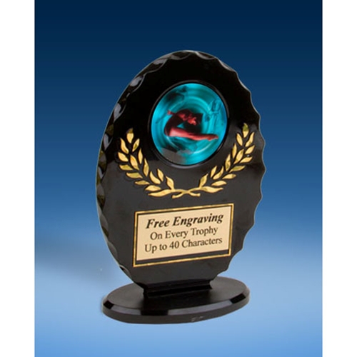 This nice 5” tall black acrylic oval accepts a 2” graphic decal of your sport/activity.  It is also available in a 6” tall version.