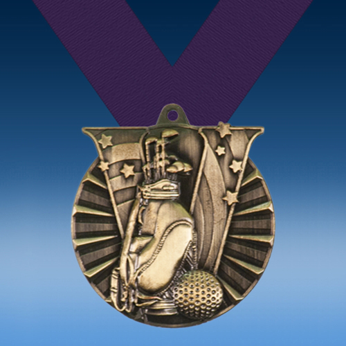Score a hole in one with our winning Golf Victory Series Medal! This large medal features highly rendered details of golf imagery in front of a victorious “V.” Available in gold, silver, or bronze finishes. Personalize the reverse side of this award with error-free engraving. Display this medal on the ribbon color of your choice for beautiful presentation. This award is perfect for recognizing top preforming golf players!