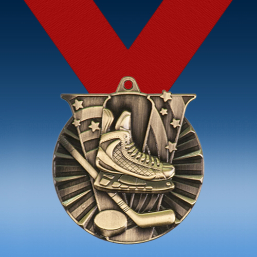 • Congratulate hockey athletes with our winning Hockey Victory Series Medal! This large medal features highly rendered details of hockey imagery in front of a victorious “V.” Available in gold, silver, or bronze finishes. Personalize the reverse side of this award with error-free engraving. Display this medal on the ribbon color of your choice for beautiful presentation. This award is perfect for recognizing hockey players who are the cream of the crop!