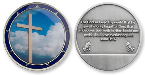 This coin is inscribed with the verse John 3:16: “For God so loved the world that he gave his only begotten Son, that whosoever believeth in Him should not perish but have everlasting life.”