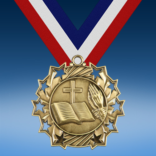 Award religious all-stars with our Religious Ten Star 3D Medal! This large medal award features 3D imagery of a cross, bible, and praying hands within a 10-star border. Available in gold, silver, or bronze finishes. Personalize the reverse side of this award with error-free engraving. Display this medal on the ribbon color of your choice for beautiful presentation. Perfect for recognizing a variety of religious achievements!