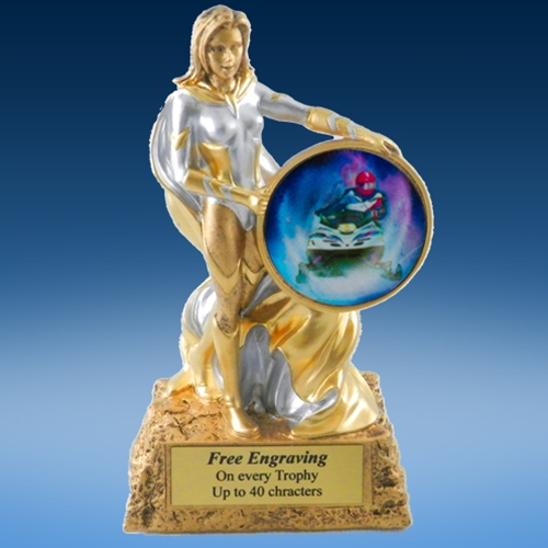 This nice 6″ tall resin, accepts a 2″ graphic decal of your sport/activity.