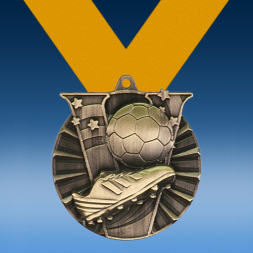 Congratulate top preforming soccer athletes with our winning Soccer Victory Series Medal! This large medal features highly rendered details of soccer cleat kicking a soccer ball in front of a victorious “V.” Available in gold, silver, or bronze finishes. Personalize the reverse side of this award with error-free engraving. Display this medal on the ribbon color of your choice for beautiful presentation. This award is perfect for recognizing outstanding achievements in soccer!